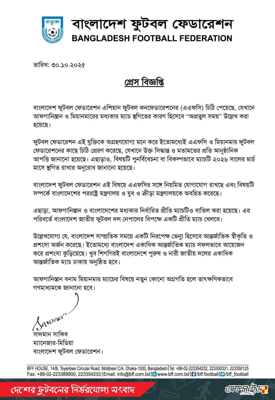আজ বিকেলে এক সংবাদ বিজ্ঞপ্তিতে বাংলাদেশ ফুটবল ফেডারেশনের পক্ষ থেকে জানানো হয়, “এএফসি থেকে প্রাপ্ত চিঠিতে ম্যাচ স্থগিতের কারণ হিসেবে ‘অপ্রতুল সময়’ উল্লেখ করা হয়েছে।” তবে বাফুফে এই কারণকে গ্রহণযোগ্য মনে করছে না। বিজ্ঞপ্তিতে আরও বলা হয়, “ফেডারেশন এই যুক্তিকে অগ্রহণযোগ্য মনে করে এএফসি ও মিয়ানমার ফুটবল ফেডারেশনের কাছে আনুষ্ঠানিকভাবে আপত্তি জানিয়েছে।”