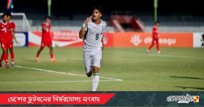 এরই ধারাবাহিকতায় ম্যাচের ১১তম মিনিটে এগিয়ে যায় বাংলাদেশ। বক্সের সামান্য বাইরে থেকে মোর্শেদের দারুণ চিপে উড়ে এসে হেডে বল জালে জড়ান মানিক।