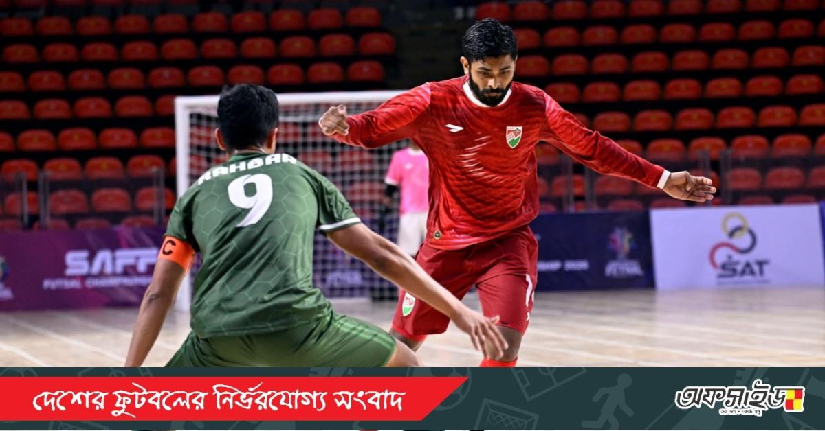 সাফ পুরুষ ফুটসাল টুর্নামেন্টে নিজেদের দ্বিতীয় ম্যাচে মালদ্বীপের বিপক্ষে ৬–১ গোলে হেরেছে বাংলাদেশ। ম্যাচের শুরু থেকেই মালদ্বীপের আধিপত্য স্পষ্ট ছিল। প্রথমার্ধেই তারা ৪–০ গোলে এগিয়ে যায়। প্রথমার্ধের শেষ মুহূর্তে একটি গোল করে ব্যবধান কমায় বাংলাদেশ।