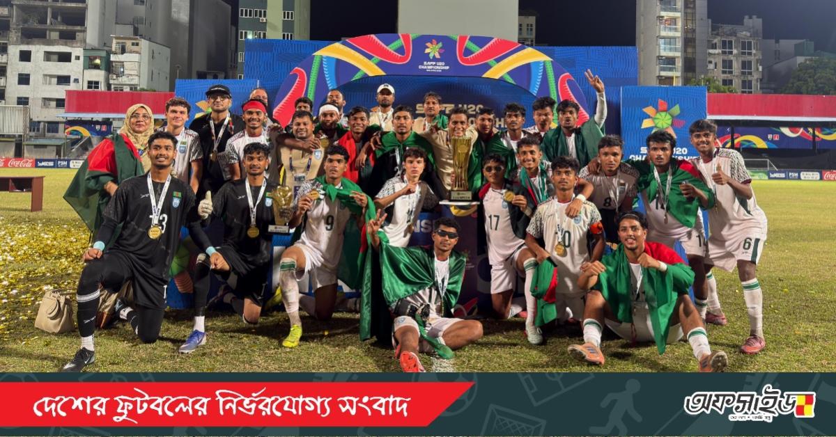 মালদ্বীপের রাজধানী মালের জাতীয় স্টেডিয়ামে শুক্রবার অনুষ্ঠিত ফাইনালে নির্ধারিত সময় গোলশূন্য থাকার পর টাইব্রেকারে ৪-৩ গোলে জয় পায় বাংলাদেশ। এতে প্রথমবারের মতো ভারতকে হারিয়ে সাফ অনূর্ধ্ব-২০ চ্যাম্পিয়নশিপের শিরোপা জিতে নেয় লাল-সবুজের প্রতিনিধিরা।